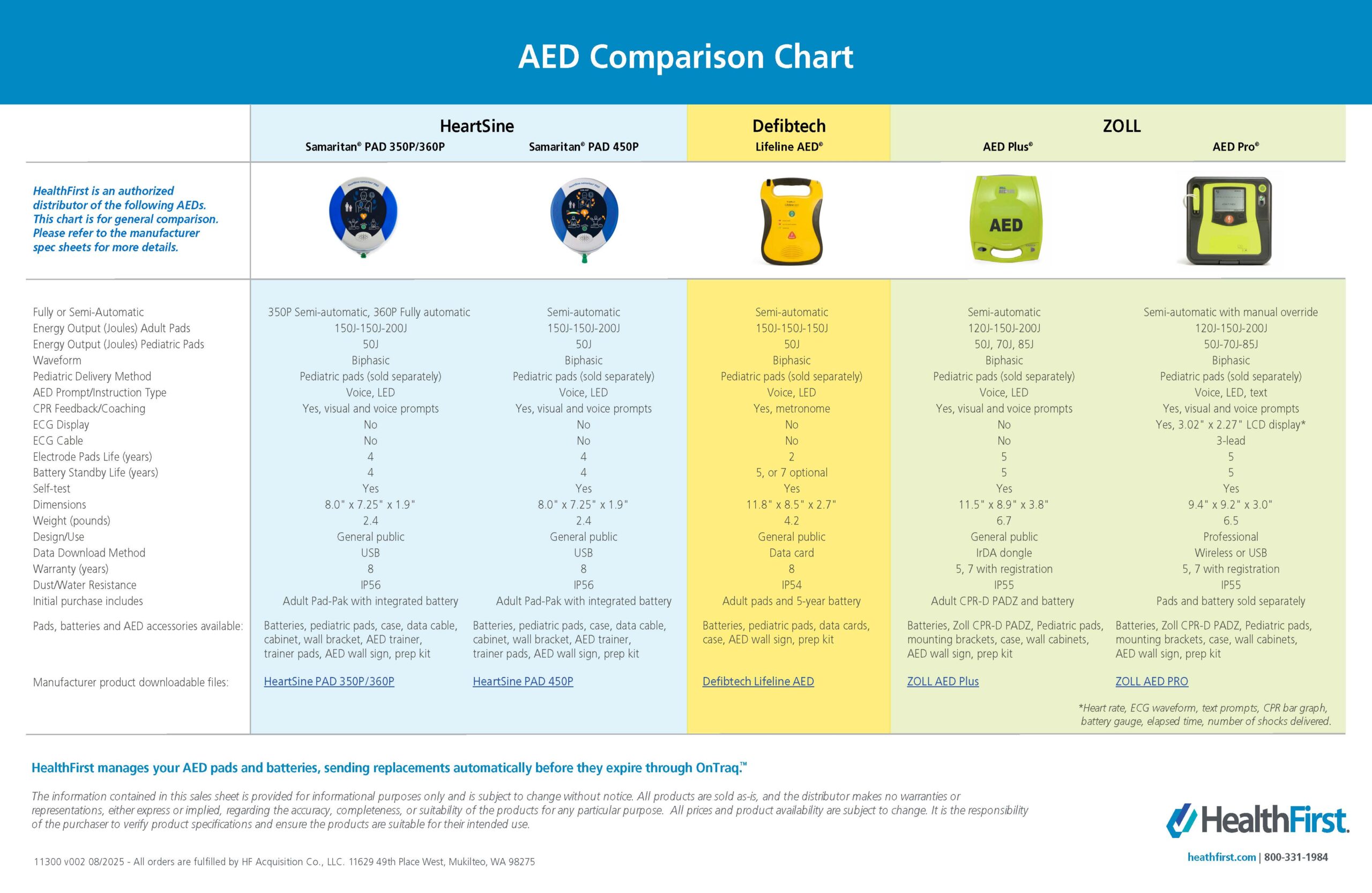HealthFirst takes the hassle out of managing your AED pads and batteries by leveraging our smart automation platform, OnTraq. Our system monitors expiration dates and proactively replaces expiring products. This AED features a straightforward design, guided voice prompts, and long battery life.